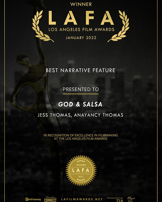 “Mis más profundas felicitaciones a Jess y Anayancy por arriesgar tanto mientras confiaba en que esto sería un éxito. En las escenas de baile tuvimos que mostrar el aprendizaje de principiantes. Le dije a algunos de mis antiguos estudiantes que bailaran como solían hacerlo antes de tomar clases. Varias escenas después se ponen a bailar normalmente. OMG me hicieron parecer el mejor maestro del mundo”. Expresó Enio Córdoba en su cuenta de Faceboook por el galardón obtenido para God & Salsa como mejor largometraje narrativo en los Premios de Cine de Los Ángeles.